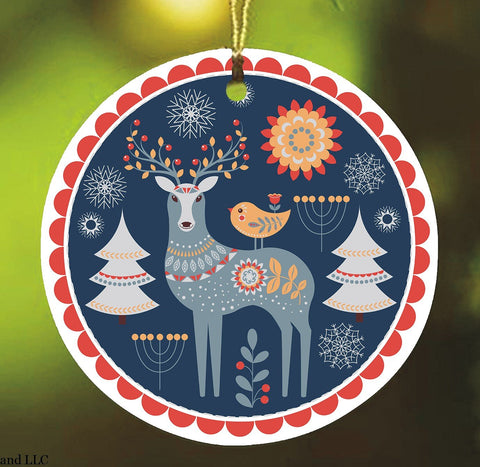 Scandinavian Folk Forest Animal Pattern Christmas Ornament, Deer, Fox, and Owl