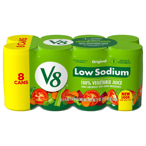100% vegetable juice from concentrate with added ingredients. Low sodium. Gluten free. Excellent source of Vitamin C. 1 serving of vegetables (1 can has 1 serving (1/2 cup) of vegetables. Dietary guidelines recommend 2-1/2 cups of a variety of vegetables per day for a 2,000 calorie diet). New look same great taste. www.v8juice.com. how2recycle.info. Questions or comments? Call us at 1-800-871-0988. www.v8juice.com.