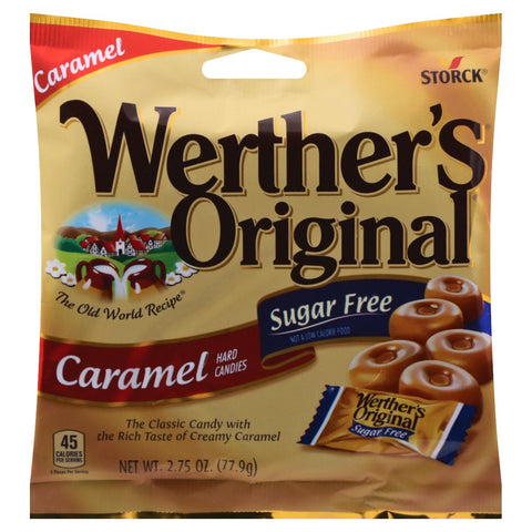 The classic candy with the rich taste of creamy caramel. Per Serving: Werther's Original Sugar free hard candies 45 calories. Regular Werther's original caramel hard candies 70 calories. Storck Part of your world. www.werthers-original.us. www.storck.us. Discover all of our Caramel creations! Made in Germany