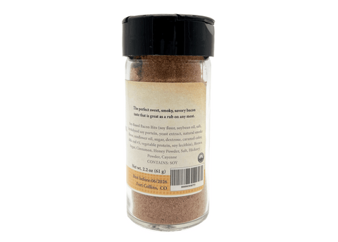Ingredients: Soy-Based Bacon Bits (soy flour, soybean oil, salt, hydrolyzed soy protein, yeast extract, natural smoke flavor, sunflower oil, sugar, dextrose, caramel color, fd&c red #3, vegetable protein, soy lecithin), Brown Sugar, Saigon Cinnamon, Honey Powder, Applewood Smoked Salt, Hickory Powder, Smoked Serrano CONTAINS: SOY