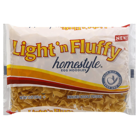 Enriched noodle product. Crafted to taste homemade, our widest egg noodles deliver simply delicious results. Create meals you feel good about serving by providing all the comforting flavors of the food you love, but with signature texture and taste of Light 'n Fluffy noodles.