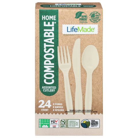 Home compostable (home. ok compost. TUV Austria. Home S2594.) Variation in cutlery color is typical of compostable materials and is considered normal. All the performance, less waste! Lifemade home compostable cutlery is made from USDA-certified bio-based material and earned the worldwide trusted TUV Austria ok compost home certification. Home compostability is lab proven and tested safe for any garden compost bin! Lifemade believes in creating products that help push industries and products forward. While how we celebrate life's moments hasn't changed much over the years, our consciousness about protecting the earth has. We design products with tomorrow in mind. Life. Made better. www.lifemadeproducts.com. how2recycle.info. This FSC Certified paperboard box is made with a minimum of 25% post-consumer recycled material. FSC. USDA Certified Biobased Product: Product 100%. BPI: Compostable. Commercially compostable only. Facilities may not exist in your area. Made in the USA.