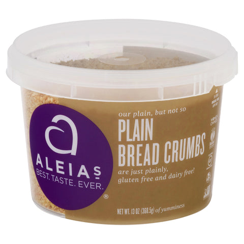 Our plain, but not so plain bread crumbs are just plainly, gluten free and dairy free! National Celiac Association. Certified gluten-free. Lovingly handcrafted and packaged in a dedicated gluten free bakery facility. Non GMO Project verified. nongmoproject.org. Best. Taste. Ever. Net wt 13 oz (368.5 g) of yumminess. www.aleias.com. Women Owned. Love the earth, Please recycle.