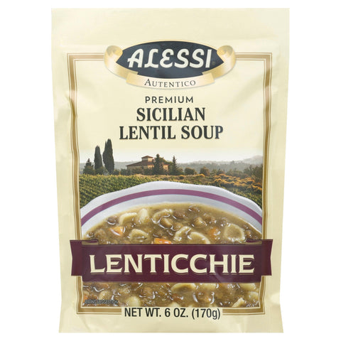 There is nothing quite as satisfying as a bowl of rich, hearty soup. Soups are eaten in almost every corner of the world and over the years, certain soups have become associated with particular countries. Italy is no exception with several regions boasting claim to some of the world's best soups. Lenticchie is the name given to the very simple yet delicious soup known as lentil. The brown lentils used in this Sicilian classic are embellished with small cut pasta and bits of carrot, garlic and, of course, finocchio (the bulb of the fennel plant). People today eat soup for different reasons than they did yesteryear. Once considered an inexpensive meal for the poor, soup has become popular among the health conscious consumers of today. There is a saying about soups in Southern Italy that states, Sette cose fa la zuppa which translates to Soup does seven things. It relieves your hunger, quenches your thirst, fills your stomach, cleans your teeth, makes you sleep, helps you digest and colors your cheeks. Give Alessi soups a try and let us know if the old saying might still prove to be right. Try our other traditional soups and Buon Appetito! www.alessifoods.com. Manufactured in the USA.