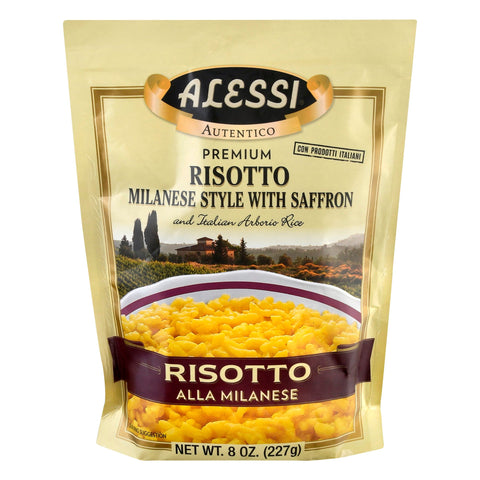 Milanese style with saffron and Italian arborio rice. Italy is Europe's largest producer of rice. The wetlands and cool temperatures of the Lombardi region harbor the ideal conditions for lush rice fields. Resourceful Italians combined rice with many other items common a dish they lay claim to. It is to their area and developed known as risotto. Rich, creamy risotto is one of Northern Italy's gastronomic delights. The key ingredient in authentic risotto is the shore thick grained rice known as Arborio. This rice is the perfect grain risotto because its texture and cooking properties allow it to retain firmness throughout preparation. Risotto should always be prepared al dente which means tender yet firm lone bite. Alessi Risotto ago Milanese is the classic risotto dish of Arborio rice is coupled with saffron, the world's not expensive spice. This robust, intensely flavored dish is the most highly regarded of all risottos and is may served with meats cooked M a red or wine sauce like Osso Buco. www.alessifoods.com. Try our other authentic risottos and buon appetito!