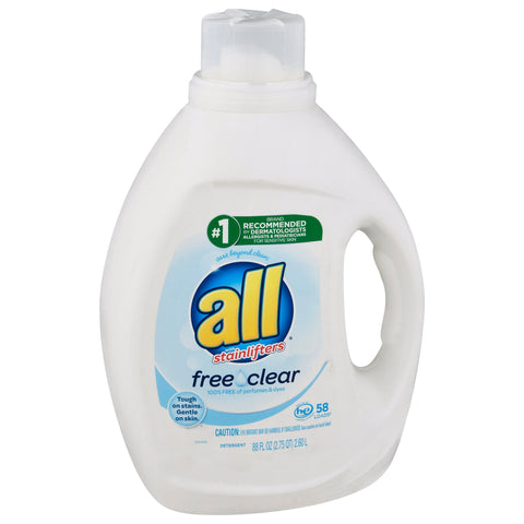 50 loads (Contains 58 regular loads as measured to lines 1). No. 1 brand recommended by dermatologists allergists & pediatricians for sensitive skin. Care beyond clean. 100% free of perfumes & dyes. Tough on stains. gentle on skin. Safe for all washing machines. Hypoallergenic. Removes 99% of the top everyday & seasonal allergens (Dog and cat dander, dust mite matter, ragweed pollen, grass/tree pollen). All is not intended to treat or prevent allergies. Safe for septic systems. Works effectively, even in cold water. As always, contains no phosphates. www.all-laundry.com. how2recycle.info. For product ingredients listing, go to www.all-laundry.com or call 1-800-457-8739. Questions? call 1-800-457-8739.Learn more at all-laundry.com. All includes biodegradable surfactants and the bottle contains 25% or more post-consumer recycled plastic.