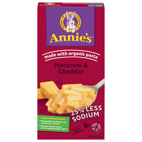 No artificial flavors or synthetic colors. 10 g protein per serving. Certified Organic by Oregon Tilth. 25% less sodium (Annie's 25% less sodium has 400 mg sodium per serving. The leading brand has 560 mg sodium per serving) than the leading brand. We work with trusted suppliers to source only non-GMO ingredients. Bunny of approval. Made with goodness. Cheese from cows not treated with rBST (No significant difference has been shown between milk derived from rBST-treated and non-rBST-treated cows). Life's better when it's delicious. So we put ooey gooey yumminess in every bite. We use wholesome real cheese and quality ingredients for dreamy, creamy mac & cheese. It's our way of sharing joy with everybunny. Made with love by Annie's. Annies.com. how2recycle.info. We love to hear your feedback! Contact us at annies.com or 1-800-288-1089 and reference the best if used by date. Box Tops for Education: No more clipping. Scan your receipt. See how at btfe.com. Hoppiness Starts Here: Visit annies.com to learn about our commitment to a better planet and to get a fun Annie's sticker. We reduce our bunny footprint by using: Certified 100% recycled paperboard. Minimum 35% post-consumer content. Recyclable.