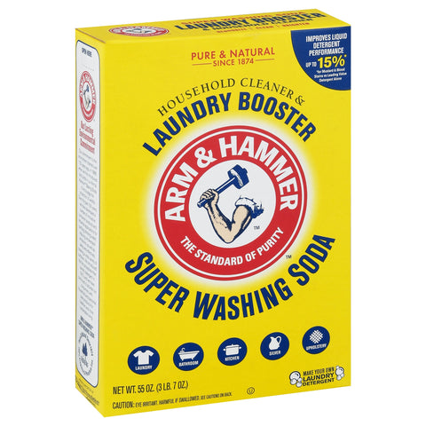 Household cleaner & laundry booster. The standard of purity. Pure & natural since 1874. Improves liquid detergent performance up to 15% (for mustard & bloodstains vs leading Value Detergent Alone). Make your own laundry detergent. Laundry, bathroom, kitchen, silver, upholstery. Deodorize, Clean, Brighten Simple ingredients, simple solutions. Arm & Hammer Super Washing Soda is a natural detergent booster and freshener and can be used all around the home - not just in the laundry room! Natural cleaning all around the home. Did you know you can make your own laundry detergent? Super Washing Soda is an important ingredient in most do-it-yourself laundry detergent recipes. 100% fragrance & phosphate free. Deodorize, Clean, Brighten: Laundry, kitchen, bathroom, silver, hard water, upholstery and more! The Arm & Hammer Guarantee: We unconditionally guarantee that this product will clean and freshen your clothes, or your money back. If you are not satisfied in any way, please call our Consumer Relations Department at: 1-800-617-4220 9am-5pm ET. We welcome your comments and questions. armandhammer.com. how2recycle.info. Follow us on Pinterest & see more uses for Super Washing Soda on armandhammer.com. Try our recipe at armandhammer.com/diy-detergent. Proud supporter of Arbor Day Foundation. arborday.org. Certified Renewable Energy: Green-e - Made with 100% certified renewable electricity. Our Lasting Environmental Commitment: Our commitment to the environment started over 120 years ago, in 1888, when we first introduced bird cards in our Arm & Hammer Baking Soda to encourage the protection of wildlife. Over the past 100 years, we have developed a number of innovative consumer products and industrial applications for purifying drinking water, reducing smokestack emissions, as well as safely and effectively cleaning a wide variety of surfaces. We introduced the first phosphate-free laundry detergent in 1970, and we have continued to provide our consumers with household and personal care products for healthier and more sustainable living.