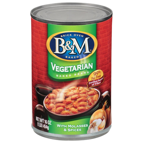 Baked beans vegetarian with molasses & spices. 99% fat free. Excellent source of fiber. Brick oven baked. Delicious B&M Baked Beans are slow-baked in brick ovens for hours. Our baking method produces baked beans with a perfect texture and deep flavor unlike any others. B&M baked beans are sweetened with molasses and sugar, are an excellent source of fiber and 99% fat free. With B&M Baked Beans, you'll enjoy every spoonful! www.bmbeans.com. Questions or Comments? Call 1-800-813-2165 or visit www.bmbeans.com.