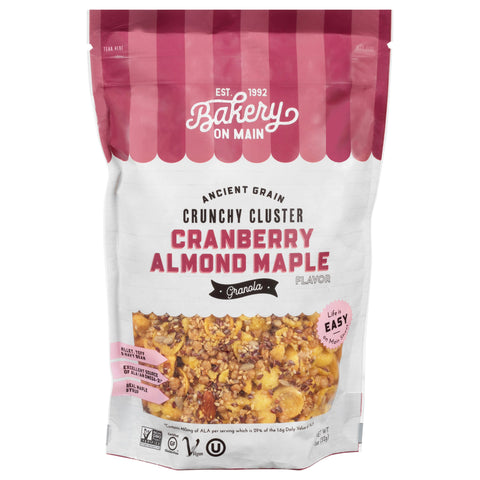Certified gluten-free. Vegan. Excellent source of ala (an omega-3) (Contains 460 mg of ala per serving which is 29% of the 1.6 g daily value of ala). Non GMO Project Verified. nongmoproject.org. Est. 1992. Ancient grain. Millet, teff & navy bean. Real maple syrup. Life is easy on main street. With bakery on main, life is easy on main street! Since 1992, we've prided ourselves on our ability to craft incredibly delicious gluten-free and celiac-friendly granola. It's our belief that everyone should be able to enjoy food that doesn't sacrifice taste for wholesomeness, or indulge in a snack that's filling, nutritious, and fits perfectly within any individualized dietary wants and needs. That's the Bakery On Main promise - simple, effortless eating and snacking that's always on your terms. Our gluten-free granola is packed with beneficial nutrients and powerful ancient grains. Combining the delicious flavors of cranberry, almond, maple and premium multigrain & bean crisps, this granola is perfect for sprinkling over yogurt or into a bowl of milk for a wholesome breakfast. bakeryonmain.com. Facebook. Instagram. (at)BakeryOnMain. Our mission to give back-learn more. Try It Out: Over yogurt. Ice cream topper. Out of the bag. Try our other delicious products. Sprouted blueberry flax.