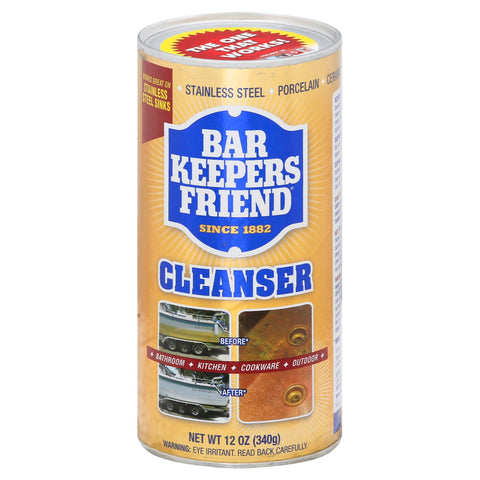 Works great on stainless steel sinks. Stainless steel. Ceramic. Copper. Brass. Fiberglass. Corian. Chrome. Aluminum. Bathroom. Kitchen. Cookware. Outdoor. Since 1882. Once tried, always used. Can opener friendly. Recommended by: All-Clad, Build.com, Calphalon, Cutco, Dacor, Electrolux, Elkay, Franke, Formica, General electric, Kohler. Tramontina, Viking, Volrath and many others. The one that works! www.barkeepersfriend.com. Follow us: Facebook; Twitter; Instagram; Pinterest; YouTube. To read BKF user reviews - Google us. Questions or comments? 1-800-433-5818. NSF: Nonfood compounds program listed (A1, A3 and A6). NSF Registration No. 145349.