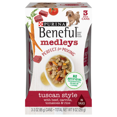 Tuscan style with beef, carrots, tomatoes & rice in sauce. No artificial preservatives, colors, or flavors. Perfect for mixing. A mouthwatering medley of tastes and textures. Protein-rich recipe with real beef, vegetables, and whole grains. No artificial colors, flavors, or preservatives. 100% Complete and balanced for adult dogs. Generous sauce that's perfect for mixing. Satisfaction Guaranteed (Visit Beneful.com/faq for more details): He'll love it! Beneful.com/ingredients. how2recycle.info. Every ingredient has a purpose: Beneful.com/ingredients. Purina.com; 1-888-236-3385. NZ 0800 738 847. Mediterranean Style; Romano Style. Pick a spoon any spoon. With two other culinary-inspired flavors and healthy ingredients, you can't go wrong. Printed in USA. Calorie Content (calculated)(ME): 832 kcal/kg, 71 kcal/can. Beneful Medleys Tuscan Style is formulated to meet the nutritional levels established by the AAFCO Dog Food Nutrient Profiles for maintenance of adult dogs.
