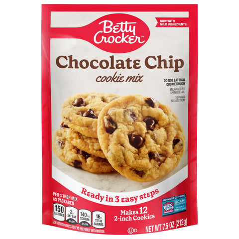 Per 3 Tbsp Mix as Packaged: 150 calories; 2 g sat fat (9% DV); 140 mg sodium (6% DV); 16 g total sugars. See nutrition facts for as prepared information. Contains bioengineered food ingredients. Learn more at Ask.GeneralMills.com. Now with milk ingredients. Ready in 3 easy steps. Makes 12 2-inch cookies. The Red Spoon Promise: The red spoon is my promise of great taste, quality and convenience. This is a product you and your family will enjoy. I guarantee it. Ask.GeneralMills.com. how2recycle.info. Instagram. Follow us for more (at)bettycrocker. Box Tops for Education: No more clipping. Scan your receipt. See how at BTFE.com.