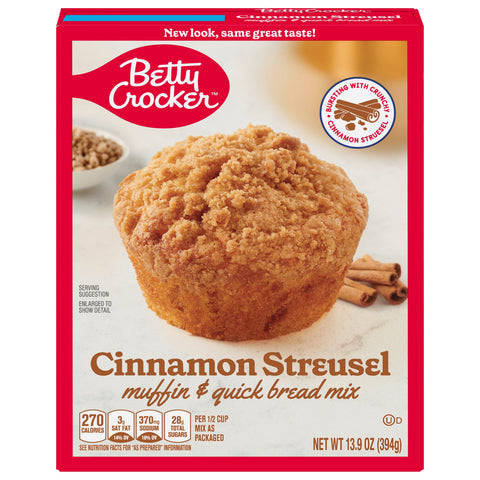 Per 1/2 Cup Mix as Packaged: 270 calories; 3 g sat fat (14% DV); 370 mg sodium (16% DV); 28 g total sugars. See nutrition facts for as prepared information. Contains bioengineered food ingredients. Learn more at Ask.GeneralMills.com. New look, same great taste. Bursting with crunchy cinnamon struesel. Betty’s Promise with a century of inspiring makers across the world, Betty Croker encourages and empowers everyone no matter their skill level, gender or age to share in the joy of homemade. From Betty’s test kitchens to yours, we promise great taste, quality and convenience. This is a product you and your family will enjoy. We guarantee it. 1-800-446-1898. BettyCrocker.com. The red spoon promise Betty by Betty Crocker. BettyCrocker.com. how2recycle.info. Follow us for more great baking ideas! Facebook. Twitter. Instagram. (at)bettycrocker. 100% Recycled paperboard.