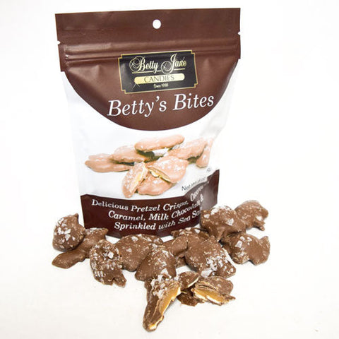 6oz. Pretzels, Gremlin Caramel and Betty Jane Milk Chocolate topped with Sea Salt.