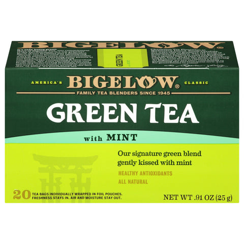 Our signature green blend gently kissed with mint. Tea is a gluten-free beverage. Non-GMO. America's classic. Family Tea Blenders since 1945. Healthy antioxidants. All natural. Tea bags individually wrapped in foil pouches. Freshness stays in. Air and moisture stay out. It's Easy Being Green: Here at Bigelow Tea, our commitment to the environment is a top priority! Each of our facilities has a dedicated green team focused on identifying ways to become more environmentally sensitive, from installing solar panels at our headquarters to enforcing company-wide composting & recycling programs. We were thrilled when our three manufacturing facilities recently achieved zero waste to landfill status. We are also extremely proud of the fact that, in 2003, we purchased the Charleston Tea Plantation in Wadmalaw Island, South Carolina. We were able to preserve 127 acres of beautiful tea bushes. The tea produced from these bushes is used exclusively for a special line of teas called American Classic Tea. Today the farm is thriving and has over 60,000 visitors a year. At Bigelow we are 100% committed to protecting the environment now, and for generations to come! - The Bigelow Family. Unlock the freshness. Here's the Key: We use special foil pouch to protect your tea any air, moisture and surrounding aromas. So open and enjoy the unparalleled flavor. Freshness. Aroma of Bigelow Tea everywhere you go! Bigelow green tea blend. We're Proud of Our Recipe: We start with only hand-picked green tea from higher elevation gardens, then carefully blend it with a clean and refreshing mint. One cup and you will find our tea smooth and soothing from start to finish. Our Promise: We're fully committed to your satisfaction and we love to hear from you! When you do call, please share the code number on this box with the Consumer Service crew. bigelowtea.com. Our boxes, tea bags, strings and tags are 100% biodegradable and we encourage you to your part. Thanks! Blended and packaged in the USA.