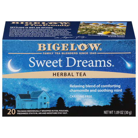Relaxing blend of comforting chamomile and soothing mint. Caffeine free. Caff-O-Meter (Represents average caffeine content; individual products may vary): Content per serving. Coffee: 100-120 mg; Black Tea: 30-60 mg; Green Tea: 25-50 mg; Decaf Tea: 1-8 mg; Herbal Tea: 0 mg. Non GMO. Family tea blenders since 1945. America's Classic. 20 tea bags individually wrapped in foil pouches. Freshness stays in. Air and moisture stay out. Bigelow - Times change, our tea doesn't. Taste will always be our family's number one priority, You can always count on superior quality and ingredients which is what makes every cup of Bigelow tea so special. While our packaging has evolved over the years, one thing remains timeless: our recipes. Since 1945, we've been committed to excellence and now we are excited to share with you our refreshed look. We feel this new design truly represents the beauty of our teas. We hope you agree. - The Bigelow Family. Because Flavor Matters: Our family selects ingredients so carefully that they must protect them in foil to allow you to experience their full. Flavor. Freshness. Aroma. Bigelow Herbal Blend: Sweet Dreams - Our family is proud of our recipe each ingredient below has been carefully selected by the Bigelow family to deliver an uncompromised tea experience. Protected in foil. Our Promise: We love to hear what you have to say. If you do call our Consumer Services Crew please reference the code on our box. bigelowtea.com. Certified B Corporation. Proud to be: Zero-Landfill Company. Green-e: Made with 100% certified renewable energy. Our folding cartons are recyclables. Our tea bags are compostable. Blended and packaged in the USA. Manufactured in the USA 100% American family owned.