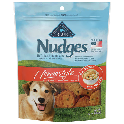 Natural dog treats enhanced with mineral. No corn, wheat or soy. Love the like family. Treat them like family. No artificial preservatives. Big or small, gentle or playful - no matter how your dog nudges you, it always brings you joy. Nudge them back with delicious, natural Nudges dog treats. This product may naturally change color after opening. Product Guarantee: If for any reason you are not 100% satisfied, we will gladly replace the product or give you your money back (roof of purchase required). Call us at 1-800-919-2833. Monday-Friday 8 a.m. to 5 p.m. CT. Please have the packaging available when contacting us. Introducing buddies your partner in pet parenthood. Download the app. Resealable for freshness. Made in USA with the world's finest ingredients. Calorie Content (ME Calculated): 2,880 kcal/kg; 39 kcal/piece.