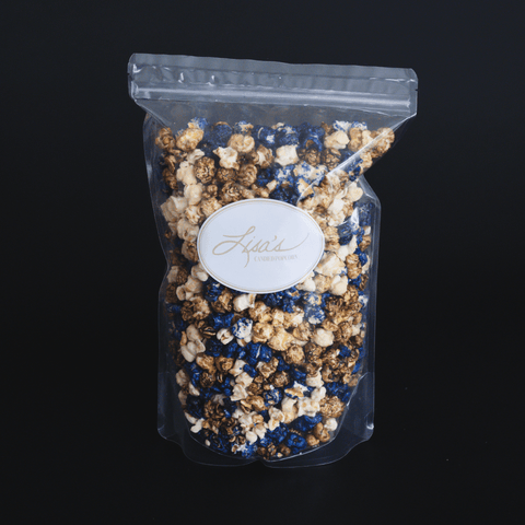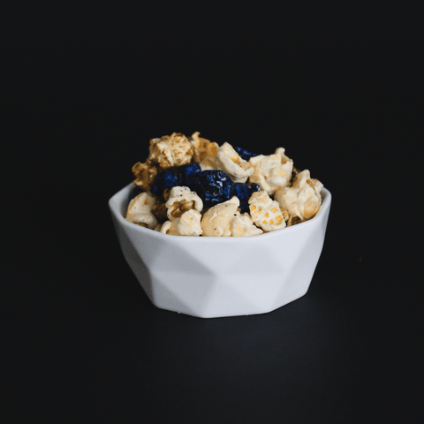 A unique and delicious treat, blueberry muffin popcorn is a combination of candied sweet dough blueberry, and buttery vanilla popcorn mixed together.