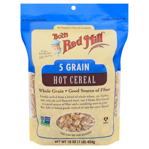 Whole grain. Good source of fiber. Non-GMO Project verified. nongmoproject.org. An employee-owned company. To your good health. Freshly milled from a blend of whole wheat, rye, barley, oats, triticale and flaxseed meal, our 5 Grain Hot Cereal is a good source of fiber and a satisfying start to your day. Add to baked goods instead of oats for extra flavor! You can see your quality. Dear Friends, I look forward to a delicious bowl of hot cereal every morning - to my mind, there's no better or tastier way to start the day. That's why we offer dozens of wholesome, satisfying hot cereals at Bob's Red Mill, including our 5 Grain Hot Cereal. You'll find an extraordinary variety of flavors, textures and nutrients to enjoy. I invite you to embark on your own whole grain adventure! To your good health, -Bob Moore. bobsredmill.com. For more information and recipes, visit bobsredmill.com. Resealable package.
