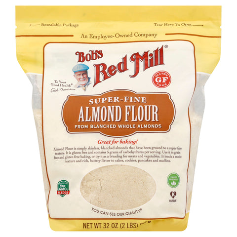 From blanched whole almonds. An employee-owned company. To Your Good Health. - Bob Moore. Great for baking! Almond flour is simply skinless, blanched almonds that have been ground to a super-fine texture. It is gluten free and contains 5 grams of carbohydrates per serving. Use it in grain free and gluten free baking, or try it as a breading for meats and vegetables. It lends a moist texture and rich, buttery flavor to cakes, cookies, pancakes and muffins. Paleo friendly. You Can See Our Quality. Dear Friends, nowadays, so many of the products you find in grocery stores are processed to the point that they can barely be considered food at all. Sometimes you can't even pronounce half of the things in the ingredients list! At Bob's Red Mill, we just don't do it that way. When it comes t grains, nuts and seeds, we think nature got it right. Pure and simple. Those are the perfect words to describe Bob's Red Mill Almond Flour. Take a look at the ingredients, or rather, the ingredient. That's right. There's only one: almonds. It doesn't get much simpler than that. And we think that's just how it should be. Gluten free. Tested and confirmed gluten free in our quality control laboratory. Reasons to Love Almond Flour: Grain free. Paleo Friendly. Good source of vitamin E. Sourced Non-GMO Pledge: For more information on our Sourced Non-GMO Pledge, visit: bobsredmill.com/non-gmo. Find inspiring recipes at bobsredmill.com.