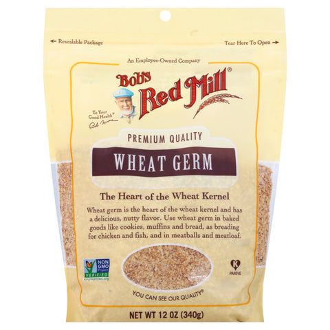 Non-GMO Project verified. nongmoproject.org. An employee-owned company. To your good health. Bob Moore. The heart of the wheat kernel. Wheat germ is the heart of the wheat kernel and has a delicious, nutty flavor. Use wheat germ in baked goods like cookies, muffins and bread, as breading for chicken and fish, and in meatballs and meatloaf. You can see our quality. Dear Friends, Forty years ago my wife, Charlee, and I founded Bob's Red Mill Natural Foods with the mission of bringing people back to basics with nutritious whole grains and minimally processed foods. Today, we take pride in offering high quality, wholesome foods like this wheat germ, so you can bring something truly special to the table. To your good health, - Bob Moore. bobsredmill.com. For more information and recipes, visit bobsredmill.com. For information and recipes, visit bobsredmill.com. Resealable package.