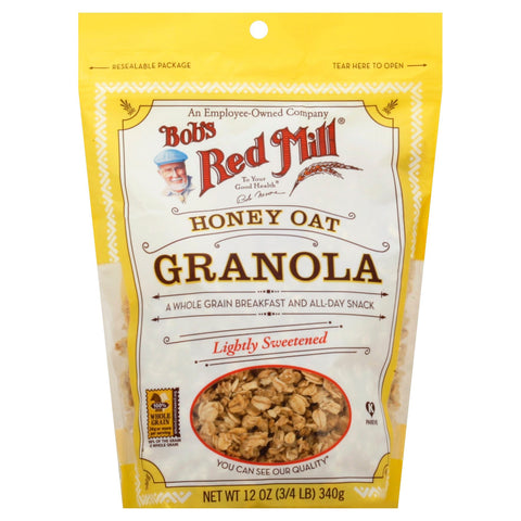 Resealable package. An employee-owned company. To your good health - Bob Moore. A whole grain breakfast and all-day snack. You can see our quality. Dear friends, what better way to start the day than with a bowl of our whole grain granola? Not only is our granola delicious, it's also packed with nutrition. Many manufacturers pulverize grains into oblivion, willfully removing the nutritious bran and germ, only to reconstitute what remains with added fillers, colon and artificial flavors. At Bob's Red Mill, we do it differently. Our Honey Oat Granola is made from whole grain oat groats that arc simply rolled and lightly kiln-toasted. No high fructose corn syrup, no hydrogenated oils, and no artificial preservatives. Each and every ingredient is one you will recognize and can feel good about eating. Eating a bowl of whole grain granola topped with milk is one of the easiest and tastiest ways to start your day with a whole grain breakfast. But that isn't the only way to enjoy granola. Heat your bowl of granola and milk in the microwave for a scrumptious hot cereal, use it as a topping for your favorite yogurt for a light lunch, or try it on top of ice cream for a wonderful treat. You can also eat it right out of the bag! I hope you will enjoy our Honey Oat Granola as much as I do. To your good health, Bob Moore. Reasons to Love Bob's Red Mill Honey Oat Granola: 36 grams whole grains per serving; good source of fiber; 6 grams protein per serving; delicious hot or cold; wholesome on-the-go snack; tasty addition to baked goods. 100% Whole Grain: 36 g or more per serving. 100% of the grain is whole grain. WholeGrainCouncil.org. Still hungry? Go to BobsRedMill.com to learn more about all of our products.
