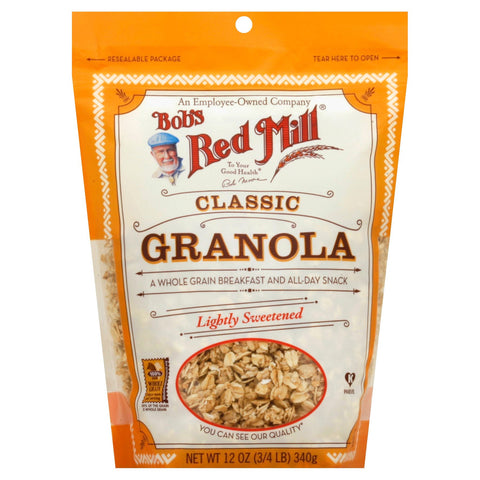 Resealable package. An employee-owned company. To your good health - Bob Moore. A whole grain breakfast and all-day snack. You can see our quality. Dear friends, what better way to start the day than with a bowl of our whole grain granola? Not only is our granola delicious, it's also packed with nutrition. Many manufacturers pulverize grains into oblivion, willfully removing the nutritious bran and germ, only to reconstitute what remains with added fillers, colon and artificial flavors. At Bob's Red Mill, we do it differently. Our Classic Granola is made from whole grain oat groats that arc simply rolled and lightly kiln-toasted. No high fructose corn syrup, no hydrogenated oils, and no artificial preservatives. Each and every ingredient is one you will recognize and can feel good about eating. Eating a bowl of whole grain granola topped with milk is one of the easiest and tastiest ways to start your day with a whole grain breakfast. But that isn't the only way to enjoy granola. Heat your bowl of granola and milk in the microwave for a scrumptious hot cereal, use it as a topping for your favorite yogurt for a light lunch, or try it on top of ice cream for a wonderful treat. You can also eat it right out of the bag! I hope you will enjoy our Classic Granola as much as I do. To your good health, Bob Moore. Reasons to Love Bob's Red Mill Classic Granola: 34 grams whole grains per serving; good source of fiber; 6 grams protein per serving; delicious hot or cold; wholesome on-the-go snack; tasty addition to baked goods. 100% Whole Grain: 34 g or more per serving. 100% of the grain is whole grain. WholeGrainCouncil.org. Still hungry? Go to BobsRedMill.com to learn more about all of our products.