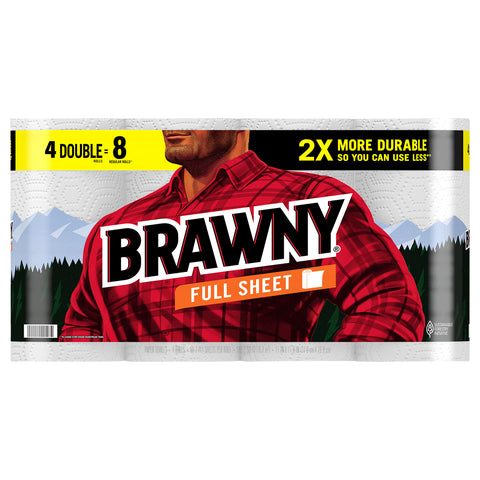 180.2 sq ft (16.7 m2) 11 in x 5.9 in (27.9 cm x 14.9 cm). 4 double rolls = 8 regular rolls (vs. leading store brand mainstream towel). 2x more durable so you can use less. Since 1974, the Brawny brand has been an American icon of strength and durability. It is the original, big, tough towel. Engineered to handle the tough messes life can dish out. Giving you the confidence to accept all challenges and inspiring you to be your best self. So, stay strong. Stay resilient. Stay giant. www.brawny.com. Sign up for savings and more at brawny.com/savings. Visit our website at: www.brawny.com. Brawny is available in these sheet sizes: Full sheet. Pick-A-Size. Tear-A-Square. Sustainable Forestry Initiative. Certified Sourcing. www.forests.org. Oh hey! Did you know? Learn more about how Brawny paper towels help promote healthy forests at Brawny.com/sustainability. Made in the USA with domestic and foreign materials for Georgia-Pacific Consumer Products.