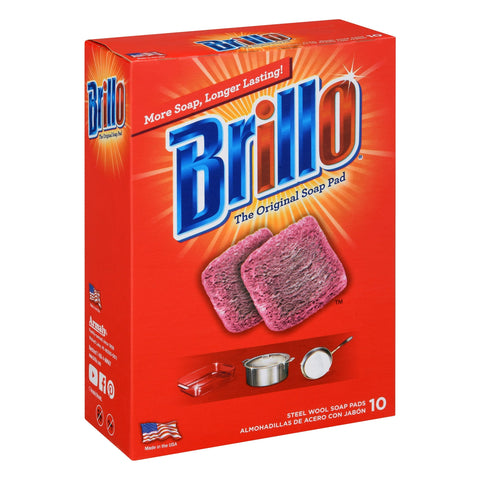 More soap, longer lasting! The original soap pad. Family-owned since 1908. Original grease fighting soap cuts through tough messes. Bonded edges maintains shape of pad. Anti-rust formula resists rust. Brilliant beyond the sink. Brillo helps cut through grime and leaves tough-to-clean surfaces brilliant. Cookware: silverware, dishes & bowls, bakeware, glassware, utensils, pots & pans. Indoors: stovetops & ovens, burners, tile floors, countertops, stainless-steel sinks, glass shower doors. Outdoors: barbecue grills, tires/wheels, machinery & tools, outdoor patio, furniture, golf clubs. www.Brillo.com. YouTube. Facebook. Pinterest. Questions? 888-4-ARMALY. See our entire family of proven cleaning solutions designed to tackle everyday messes at Brillo.com. Our Environmental Commitment: Contains biodegradable soaps and detergents. Contains no phosphorus. Box made from 100% recycled materials with 35% post-consumer sources. When composted, the box is biodegradable. Made in the USA.