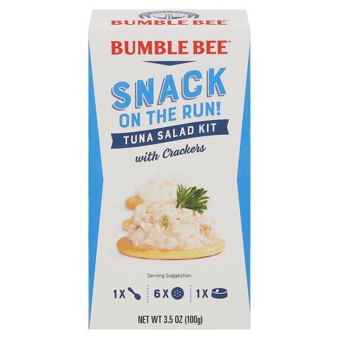 Snack on the run! Mmm - So snackalicious. Feeling hungry? Craving protein? In a rush? We gotcha covered. Bumble Bee Snack on the Run! kits have it all. Tasty protein (Tuna salad is a good source of protein. Please see nutrition information for fat content). Great flavors. Crisp crackers. And a handy spoon for instant gratification. Already mixed ready to go. Open up and say yum. Stack 'em. Snack 'em. Love 'em. It's what’s inside that counts. What's Inside: 6 buttery crackers. 1 handy spoon. 1 Bumble Bee tuna salad. So creamy. So classic. bumblebee.com. For inquiries concerning product, include number shown on carton and can end. Wild caught. Dolphin Safe.