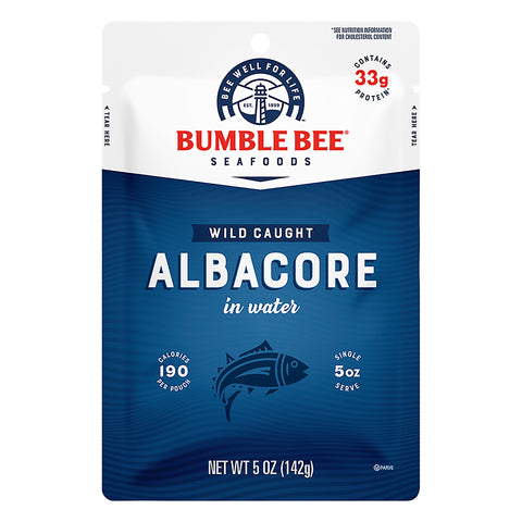 5 oz single serve. Contains 33 g protein (See nutrition information for cholesterol content). 190 calories per pouch. Gluten free. High protein. Non GMO Project Verified. nongmoproject.org. Bee well for life. Est. 1899. Premium quality. Wild caught. Go wild for albacore. Sure there are lots of fish in the sea, but there's only one bumble bee. Wild caught. Dolphin safe. Amazing albacore. This albacore tuna is firm, flavorful, and packed with protein. Dive in. www.bumblee.com. Tracemycatch.com. Facebook. Pinterest. Instagram. Twitter. For inquiries concerning product, include UPC bar code numbers and code printed on back of pouch. Interested in where your tuna came from? tracemycatch.com. Wild Caught. Dolphin safe. Product of Thailand.