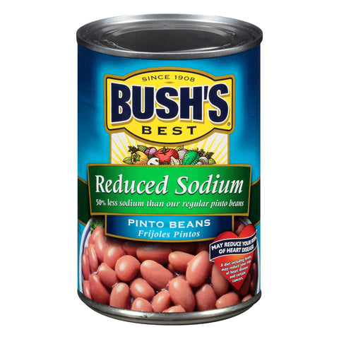 This product contains 220 mg of sodium per serving versus 450 mg for our regular pinto beans. May reduce your risk of heart disease. A diet including beans may reduce your risk of heart disease and certain cancers. Reduced sodium. 50% Less sodium than our regular pinto beans. Since 1908. www.bushbeans.com. For more recipes visit: www.bushbeans.com. 1-800-590-3797. Please refer to the code on end of can. Steel recycles.