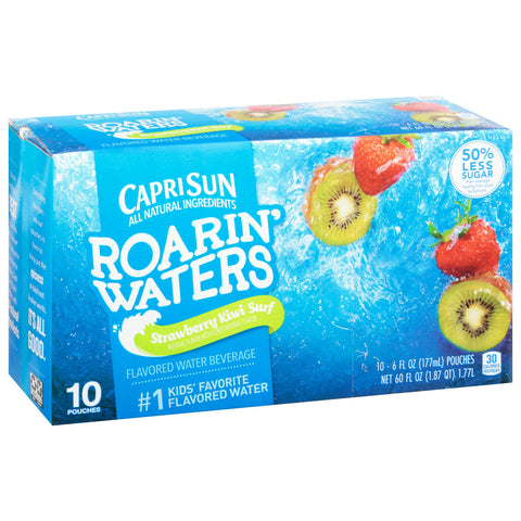 Flavored water beverage. No artificial colors, flavors or preservatives. 50% less sugar than average leading fruit juices. Per back panel (per 12 fl oz, This product 15 g total sugars, leading average fruit juices 40 g total sugars). 30 calories per pouch. No high fructose corn syrup. No. 1 kids favorite flavored water. You only want what's best for your kids, and so do we! That's why we're committed to making Capri Sun Roarin water with all-natural ingredients. Everything that goes into our pouches is there to bring out the epicness of childhood. In other words, it's all good. A wave of deliciousness. Capri Sun Roarin waters is the perfect combination of refreshing, hydrating water and the epic fruit flavors that kids love. It’s made with all natural ingredients and has 50% less sugar than the average leading fruit juices (per 12 fl oz, This product 15 g total sugars, leading average fruit juices 40g total sugars). With that much awesomeness in every pouch, Capri Sun Roarin waters is the flavored water that’s guarantee to make a splash. how2recycle.info. Contact us at: 1-800-227-7478. Please refer to code numbers on side panel or on pouch when contacting us. Check out all Our Offerings: Organic: USDA Certified Organic. 100% Juice: 100% juice blend. Caprisun: Juice drink blend. Roarin' Waters: Flavored Water Beverage. how2recycle.info.