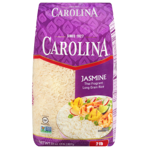 Thai fragrant long grain rice. Certified Gluten-free. Fat free. Sodium free. 0 mg cholesterol. Non GMO Project verified. nongmoproject.org. Since 1927. Make your meals stand out from the crowd with Carolina Jasmine Rice. Choosing authentic ingredients for ethnic dishes ensures a unique experience, and you'll instantly immerse yourself in the mountains of Thailand when Carolina Jasmine Rice fills your kitchen with its' aromatic fragrance. This rice also pairs wonderfully with different cuisines from around the world - allowing you to follow a recipe or create an original fusion of flavors. Carolina Rice Unites. www.carolinarice.com. For free recipes log onto: www.carolinarice.com. Questions? Comments? Call 1-800-226- 9522 Monday-Friday, 8am to 4pm Central Time. Please have the package available when calling. Product of Thailand.