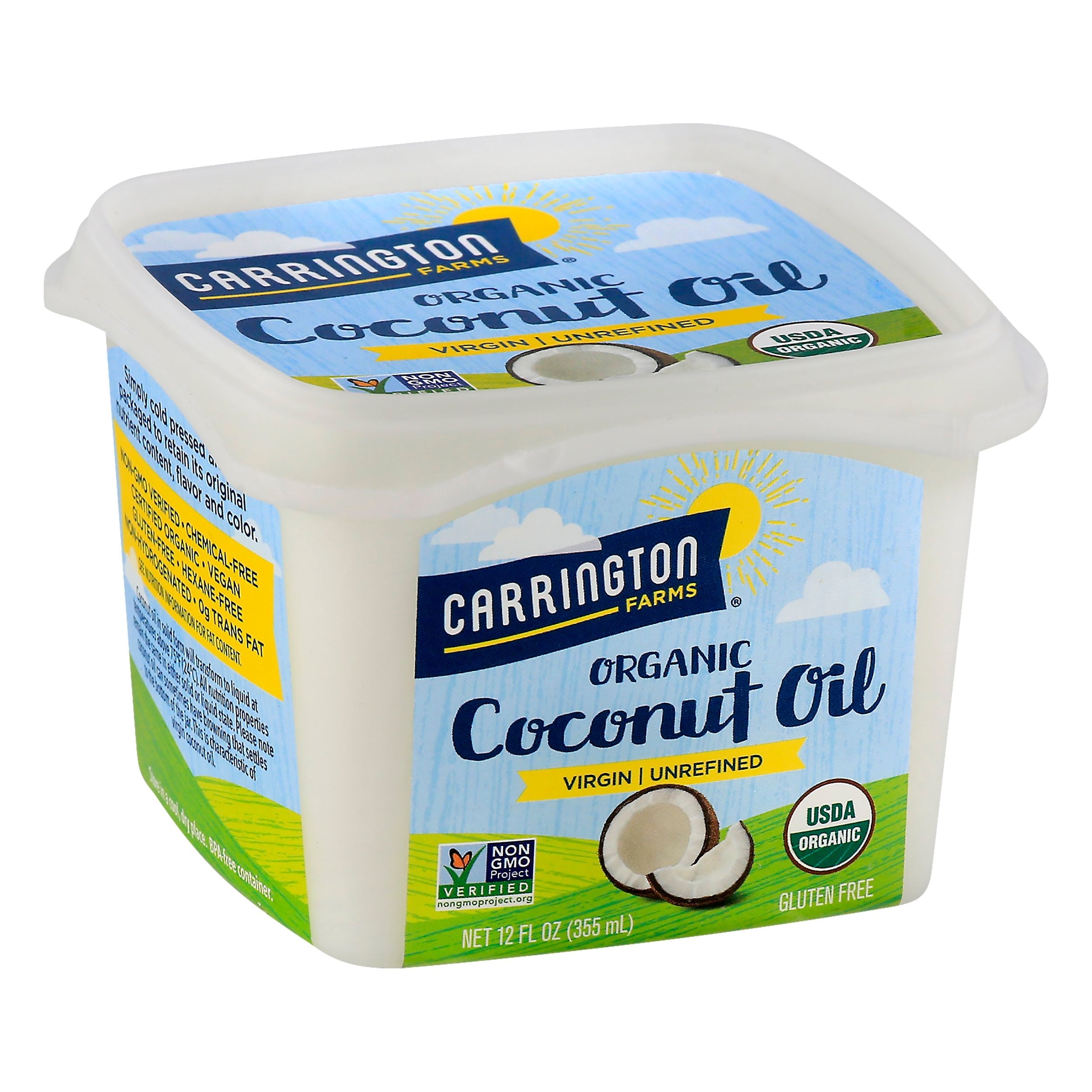 0 g trans fat. USDA Organic. Gluten free. Vegan. Certified Organic by QAI. See nutrition information for fat content. Non GMO Project verified. nongmoproject.org. Virgin. Unrefined. Saute vegetables, add to smoothies or bake up some goodies. It's also a great skin and hair moisturizer for a gorgeous glow. This organic coconut oil is the perfect alternative for butter or fats, with its light taste and 8 g of medium chian triglycerides per serving. Perfect for medium-high heat cooking up to 350 degrees F. Saute. Bake. Moisture. Simply cold pressed and packaged to retain its original nutrient content, flavor and color. Chemical-free. Hexane-free. Non-hydrogenated. Coconut oil in solid form will transform to liquid at temperatures above 75 degrees F (24 degrees C). Coconut oil in solid form will transform to liquid at temperatures above 75 degrees F (24 degrees C). All nutrition properties remain the same in either solid or liquid state. Please note coconut oil can sometimes have browning that settles to the bottom of the jar. This is characteristic of virgin coconut oil. CarrigtonFarms.com. BPA-free container. Product of Philippines. Packaged in North America
