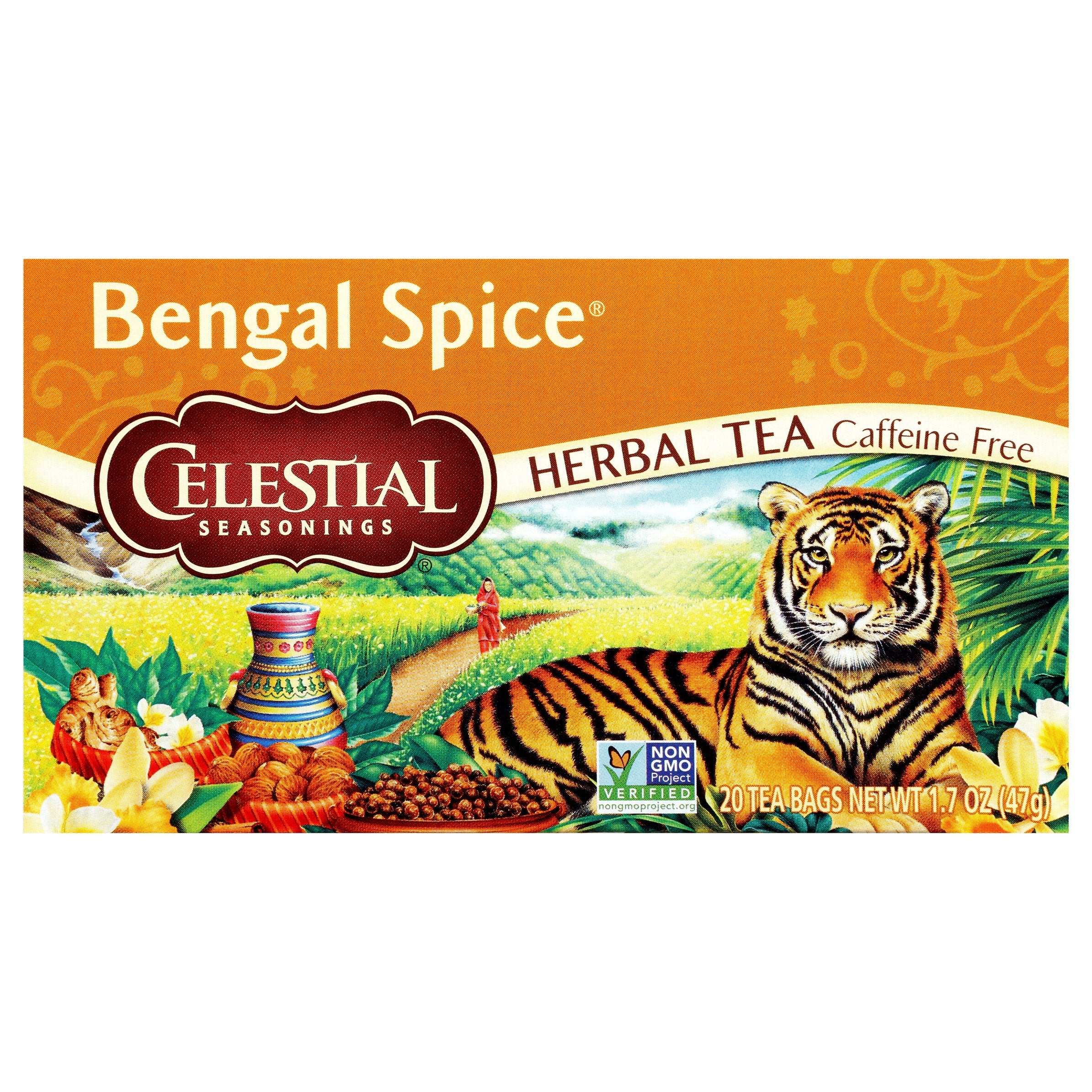 Gluten free. Caffeine free. Non GMO project verified. nongmoproject.org. Blendmaster's Notes: Bengal Spice: "Brimming with cinnamon, ginger, cardamom and cloves, this adventurous blend is our caffeine-free interpretation of chai, the piquant Indian brew traditionally made with black tea. Try it with milk and sugar for a true chai experience." - Charlie Baden, Celestial Seasonings Blendmaster. Blending herbs, art and inspiration since 1969. The Story of Celestial Seasonings: Back in 1969, we started picking herbs from the fields and forests of the Rocky Mountains and in the process, we created America's very first herbal tea. Still blended in Boulder by our expert Blendmaster, our uniquely delicious teas are made with the finest ingredients, passion and inspiration. "Variety's the very spice of life that gives it all its flavor." - William Cowper celestialseasonings.com. Made exclusively by Celestial Seasonings, Inc. The Hain Celestial Group, Inc. 4600 Sleepytime Drive Boulder, CO 80301-3292 USA.