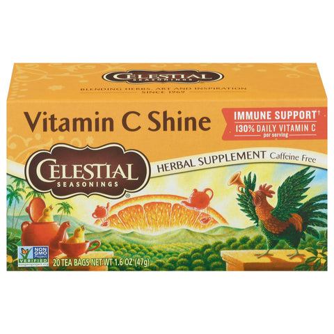 Herbal Supplement. 130% Daily vitamin C per serving. Certified gluten free. gfco.org. Caffeine free. Immune support. Non-GMO Project verified. nongmoproject.org. Blending herbs, art and inspiration since 1969. Blendmaster's Note: Vitamin C Shine. Bring a bit of sunshine to any moment with this vibrant blend. This symphony of flavors creates a harmonious medley of bright oranges, floral rosehips, fruity blackberry leaves and tangy hibiscus. Vitamin C Shine provides 130% Daily Value of Vitamin C and helps support the immune system. - Charlie Barden, Celestial Seasoning Blendmaster. The story of celestial seasonings. Back in 1969, we started picking herbs from the fields and forests of the Rocky Mountains and at that moment, we created America's very first herbal tea. Still blended in Boulder by our expert Blendmaster, our uniquely delicious teas are made with the finest ingredients, passion and inspiration. The sun just touched the morning: The morning, happy thing, Supposed that he had come to dwell, And life would be all spring. - Emily Dickinson. celestialseasonings.com. nongmoproject.org. gfco.org. Tell us what you think 1-800-351-8175, celestialseasonings.com. (These statements have not been evaluated by the Food and Drug Administration. This product is not intended to diagnose, treat, cure or prevent any disease.) Blended in Boulder, CO.
