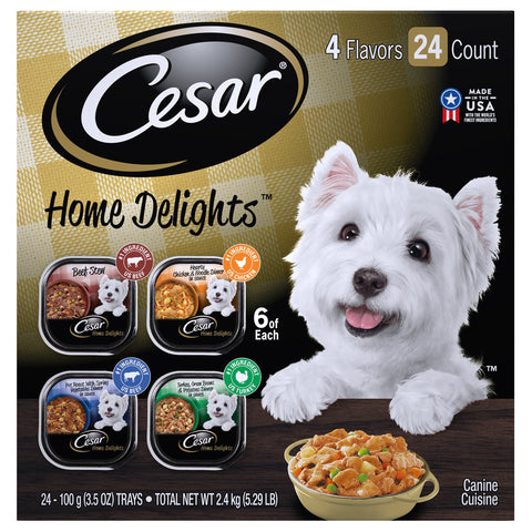 6 of Each: Beef stew. Hearty chicken & noodle dinner in sauce. Pot roast with spring vegetables dinner in sauce. Turkey, green beans & potatoes dinner in sauce. No. 1 ingredient US beef. No. 1 ingredient US chicken. No. 1 US turkey. Cesar Canine Cuisine is guaranteed to tempt even the fussiest eater. If not satisfied or to learn more call 1-800-525-5273 or visit cesar.com. cesar.com. To learn more call 1-800-525-5273 or visit cesar.com. Made in the USA with world's finest ingredients. (Cesar Home Delights Beef Stew): Calorie Content (Calculated): 917 kcal ME/kg, 92 kcal ME/tray. Cesar Home Delights Beef Stew Canine Cuisine is formulated to meet the nutritional levels established by the AAFCO Dog Food Nutrient Profiles for maintenance. (Cesar Home Delights Pot Roast with Spring Vegetables Dinner in Sauce): Calorie Content (Calculated): 917 kcal ME/kg, 92 kcal ME/tray. Cesar Home Delights Pot Roast with Spring Vegetables Dinner in sauce Canine Cuisine is formulated to meet the nutritional levels established by the AAFCO Dog Food Nutrient Profiles for maintenance. (Cesar Home Delights Hearty Chicken & Noodle Dinner in Sauce): Calorie Content (Calculated): 978 kcal ME/kg, 98 kcal ME/tray. Cesar Home Delights Hearty Chicken & Noodle Dinner in sauce is formulated to meet the nutritional levels established by the AAFCO Dog Food Nutrient Profiles for maintenance. (Cesar Home Delights Turkey, Green Beans & Potatoes Dinner in Sauce): Calorie Content (Calculated): 961 kcal ME/kg, 96 kcal ME/tray. Cesar Home Delights Turkey, Green Beans & Potatoes Dinner in sauce is formulated to meet the nutritional levels established by the AAFCO Dog Food Nutrient Profiles for maintenance.