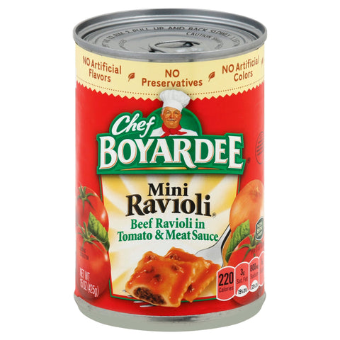 Beef ravioli in tomato & meat sauce. Per 1 Cup Serving: 220 calories; 3 g sat fat (15% DV); 800 mg sodium (33% DV); 6 g sugars. No artificial flavors. No preservatives. No artificial colors. US inspected and passed by Department of Agriculture. Quality ingredients since 1924. In 1924, Chef Hector Boiardi's (Boyardee) restaurant was so popular he began bottling his signature sauce in jars for his customers to take home. Today, Chef Boyardee maintains its quality by using ingredients such as vine ripened California tomatoes and wholesome pasta. Questions or comments, visit us at www.chefboyardee.com or call Mon.-Fri., 1-800-544-5680 (except national holidays). Please have entire package available when you call so we may gather information off the label. how2recycle.info. Non BPA liner.