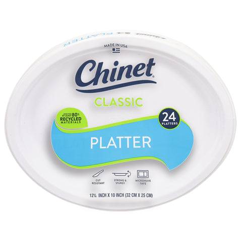 12 5/8 inch x 10 inch (32 cm x 25 cm). Cut resistant. Strong & sturdy. Microwave safe. Chinet 90 years. Chinet Classic Tableware had been proudly made in the USA for over 90 years. mychinet.com. (at)mychinet. Instagram. Facebook. Pinterest. Twitter. Check out mychinet.com for recipe and party ideas. Questions? 1.800.847.4129. Made with at least 80% recycled materials. Made in USA.