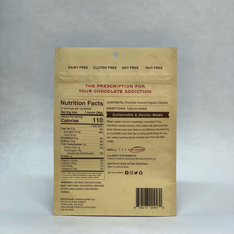 What's sweet, tart, and completely irresistible?? Our chocolate-covered organic cherries, that's what! We take local sour dried cherries and cover them in our delicious 64% chocolate for an incredible snack that has so many good things for you too - what a yummy way to increase your fruit and fiber intake.