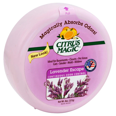 Continuous odor control. Magically absorbs odors! Ideal for: basements; closets; pet areas; cars; smoke; mold; mildew. New look! For continuous odor control in problem areas. Citrus Magic Solid Air Fresheners magically eliminate unpleasant odors, while cleaning and freshening the air. Our unique formula includes baking soda to provide convenient, continuous odor control in tough places. Ideal for: pet areas; basements; auto/RV's; closets; laundry rooms; bathrooms. Questions or Comments: 1-800-451-7096; citrusmagic.com; facebook.com/citrusmagic. Please recycle. 100% US content. USA-C.com. Made in USA certified. Made in the USA.