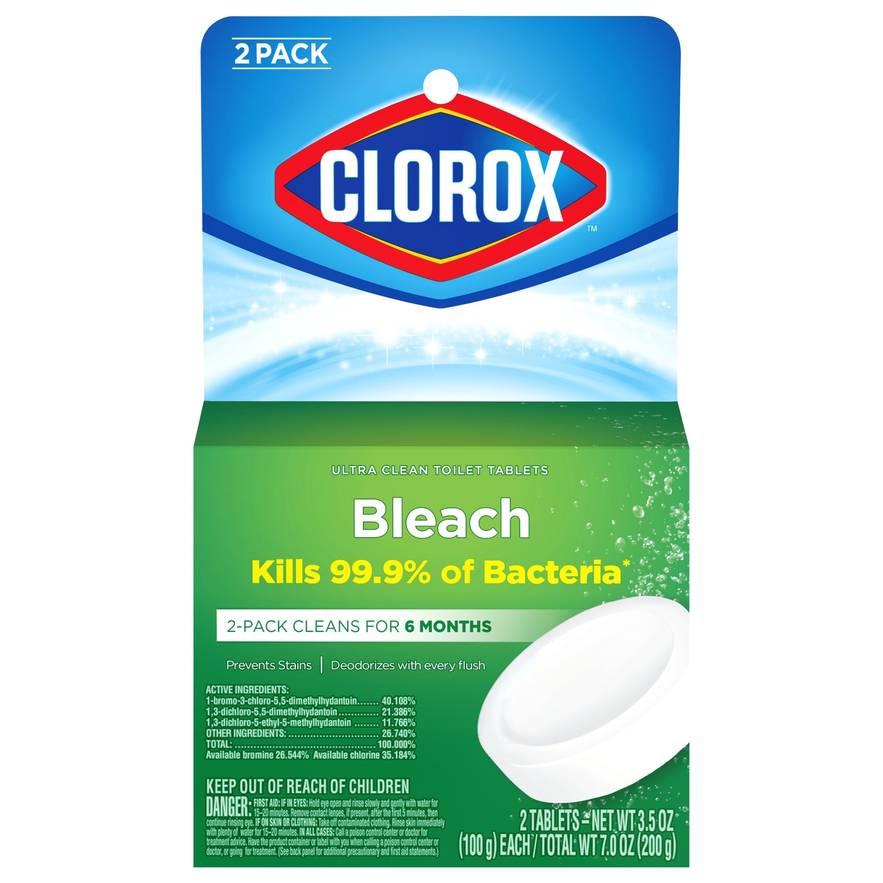 Ultra clean toilet tablets. Kills 99.9% of bacteria (Streptococcus faecalis (Strep), Salmonella enterica (Salmonella), staphylococcus aureus (Staph), escherichia coli (E. coli). 2-pack cleans for 6 months. Prevents stains. Deodorizes with every flush. Repels Tough Stains: Hard water, mineral and limescale. Product contains no phosphorus. www.smartlabel.org. how2recycle.info. Questions or Comments? Please call 1-800-227-1860 or write us at: Clorox Consumer Services, P.O. Box 24305, Oakland, CA 94612. For more product ingredient information, visit www.smartlabel.org. Also Try: Clorox toilet bowl cleaner clinging bleach gel. Environmental Commitment: Box made from 100% recycled paperboard (Minimum 35% post-consumer). Made in USA of global components.