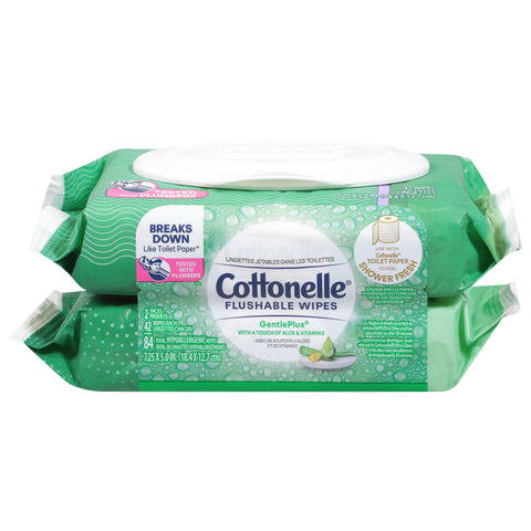 7.25 x 5.0 in (18.4 x 12.7 cm). Breaks down. Like toilet paper (Begins to break up as fast as Cottonelle Ultra Clean and has same break up after 30 minutes). Tested with plumbers. GentlePlus with a touch of aloe & vitamin E. Use with Citrolle Toilet Paper to feel shower fresh. Hypoallergenic. Alcohol free. Not for sterile use. For best results, flush only one or two wipes at a time. Cottonelle.com Use with Cottonelle Toilet Paper to feel shower fresh. FSC: Mix - Paper. IWSFG: These wipes meet flushability guidelines set by the wastewater treatment community (IWSFG 2020) and by the disposable wipes trade association (INDA). Made in the USA from domestic and imported materials.