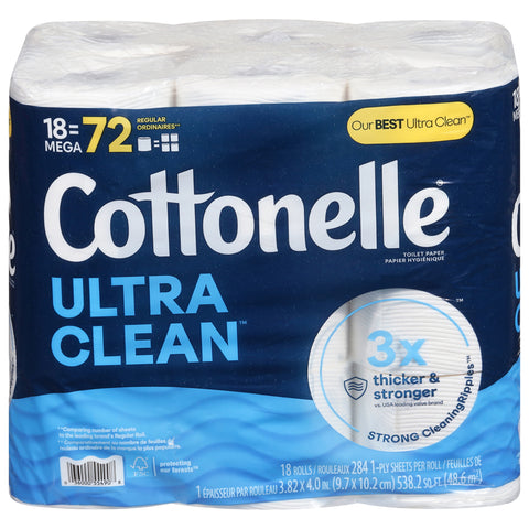 18 rolls - 284 1-ply sheet per roll. 3.82 x 4.0 in (9.7 x 10.2 cm) 538.2 sq ft (48.6 sq m). 18 mega = 72 regular (Comparing number of sheets to the leading brand’s regular roll). Our best ultra clean. 3x thicker & stronger vs. USA leading value brand. Strong CleaningRipples. Clog safe. Septic safe. Cottonelle.com. how2recycle.info. 1-800-553-3639. FSC: Protecting our forests. FSC: Mix - Paper. Supporting responsible forestry. www.fsc.org. Our Sustainability Promise: 100% recyclable packaging via store drop-off. 100% of paper sourced from responsibly managed forests. 100% recycled content used in cores.
