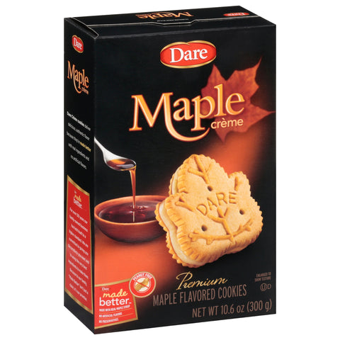 Maple flavored cookies. No artificial flavors. Peanut free. No preservatives. Dare creme cookies deliver delicious, authentic flavor because they're made better with real ingredients and no artificial flavors. For over 120 years our family-owned business has held itself to a higher standard. We are committed to giving you the products you want and to using the very best ingredients to make them. Because to our family, "Made Better" isn't just a claim, it's our promise. darefoods.com. Box made with 100% recycled fibers. Product of Canada.