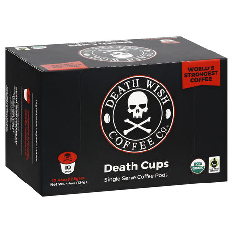 USDA Organic. Certified Organic by NFC. Fair Trade Certified. World's strongest coffee. Test your strength. For Use with: Keurig 1 & 2 Breville, Cuisinart, Mr. Coffee. The world's strongest single serve cup. Death Wish Coffee is created using the strongest possible combination of Organic and Fair Trade beans and roasting them in small batches to perfection. Death Cups use this signature blend in a convenient, single-serve cup that's both strong and, delicious. Some may say making coffee this strong is irresponsible. We like to think of it as revolutionary. Compatible with most Keurig K-Cup brewing systems including 2.0 (Compatible for use with most K-Cup brewers). World's strongest coffee. Do you have what it takes to handle a cup of the world's strongest coffee? For access to new products and deals visit deathwishcoffee.com. www.deathwishcoffee.com. Questions or comments about this product? 518-400-1050. 9 am - 5 pm EST weekdays. Recyclable capsule. Cool. Peel. Recycle. Capsule technology. Sustainable capsules in 3 easy steps: 1. Cool. 2. Peel. 3. Recycle.