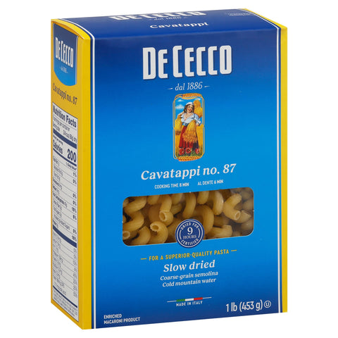 Enriched macaroni product. Non GMO non-genetically engineered ingredients (produced made with non-genetically engineered ingredients as processed verified by DNV GL). Cooking time 8 min. Dried for 9 hours certified. For a superior quality pasta. Coarse-grain semolina cold mountain water. From father to son. Since 1886 we have held the important responsibility conserving the tradition of quality pasta without compromise, using the same processing methods that were established 130 years ago. This allows us to bring the genuine pleasure of Italian cuisine to tables all over the world. The quality of our pasta is certified. From father to son. Since 1886 we have held the important responsibility of conserving the tradition of quality pasta without compromise, using the same processing methods that were established 130 years ago. This allows us to bring the genuine pleasure of Italian cuisine to tables all over the world. www.dececco.com. Discover the best recipes for a perfect italian pastsa. EPD: Environmental product declaration registration number: S-P-00282. De Cecco respeects the environment from start to finish. Made in Italy.