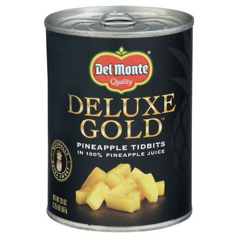 Pineapple tidbits in 100% pineapple juice. No preservatives. No added sugar (Not a low calorie food). 2x the vitamin C (Deluxe Gold Pineapple Tidbits in 100% Juice contains 61 mg vitamin C per serving compared to 12 mg vitamin C in regular canned tidbits in juice). Non GMO (Ingredients of the types used in this product are not genetically modified). Quality. Golden Goodness: Del Monte Gold Pineapple is our highest quality variety of pineapple. When you want the taste of fresh pineapple, you can feel great about serving Del Monte Deluxe Gold Pineapple. A Healthy Treat: Del Monte Deluxe Gold Pineapple has been perfected for years to be extra sweet and bursting with delicious flavor. With no added sugar (not a low calorie food) and naturally twice the vitamin C (Deluxe Gold Pineapple Tidbits in 100% Juice contains 61 mg vitamin C per serving compared to 12 mg vitamin C in regular canned tidbits in juice), it is perfect right out of the can, or for use in recipes. www.delmonte.com. how2recycle.info. Call 1-800-543-3090 (Mon-Fri). Please provide code information from the end of can when calling or writing. Non BPA (packaging produced without the intentional addition of BPA). Product of the Philippines.